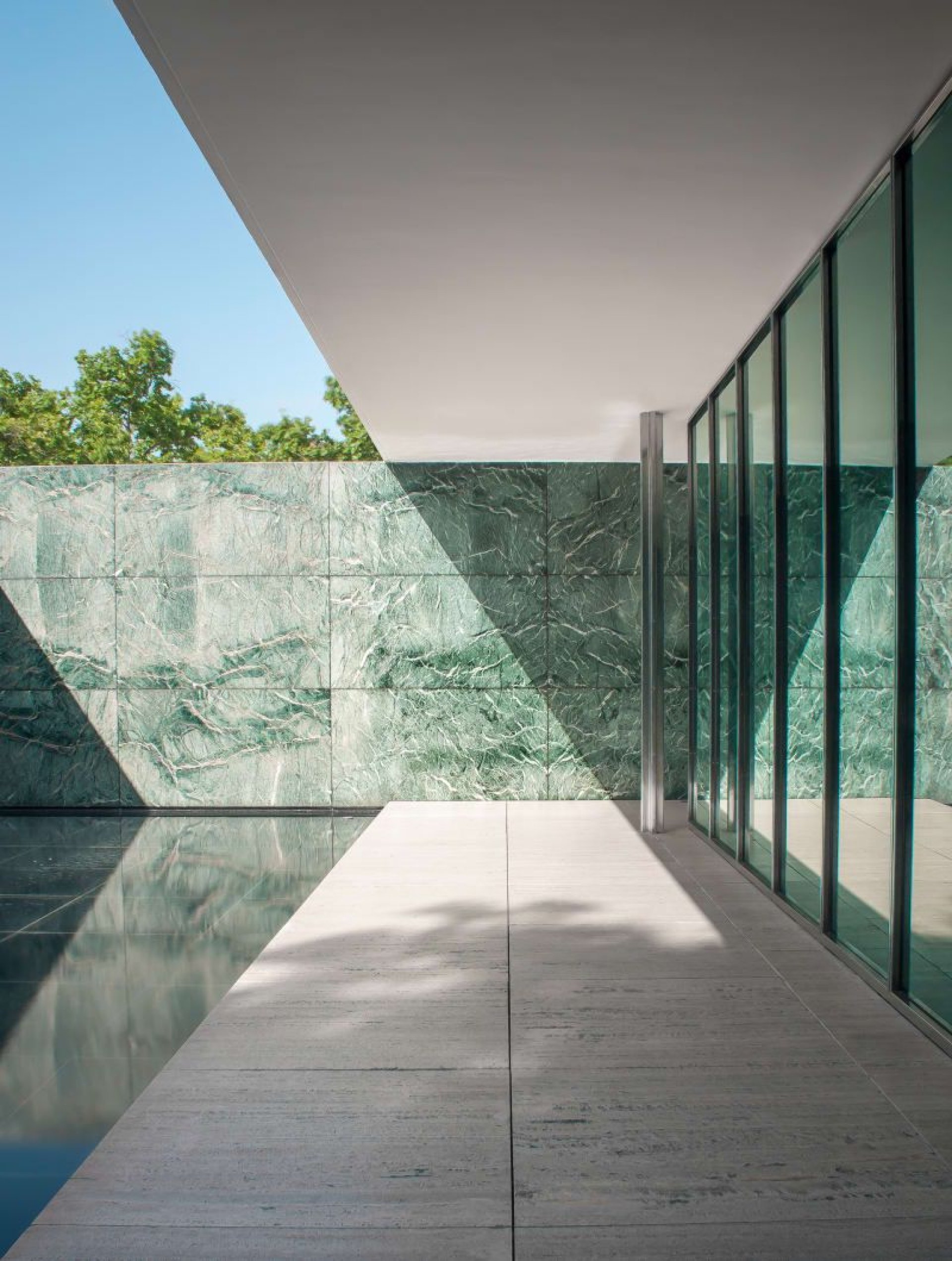 หินอ่อนใน Barcelona Pavilion ถูกใช้เป็นผนังหลักหลายจุด โดยเฉพาะหินอ่อนลายชัดที่มีการ Bookmatch อย่างประณีต ลายหินถูกจัดวางให้สมมาตรและต่อเนื่อง ทำให้ผนังหินอ่อนทำหน้าที่เสมือนงานศิลปะในตัวเอง แทนที่จะเป็นเพียงฉากหลังของสถาปัตยกรรม แนวคิดนี้สะท้อนให้เห็นว่าหินอ่อนไม่ใช่ของประดับ แต่เป็น “สถาปัตยกรรมที่มีชีวิต”